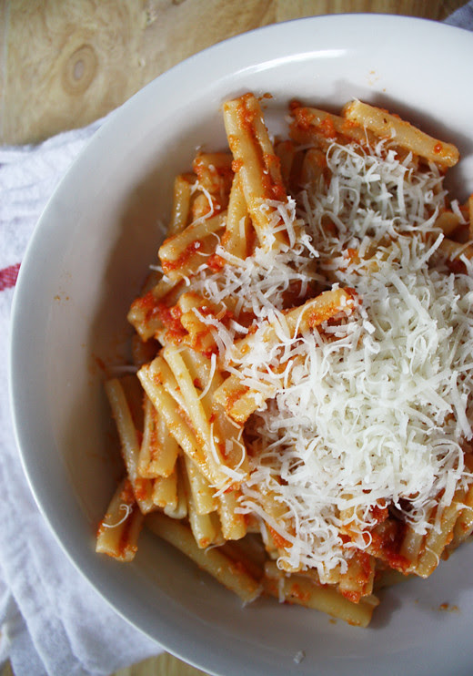 Today was the first day it's felt like autumn in Austin, and if I've ever felt like falling to my knees and kissing the now-less-infernal earth, it was this morning. This sun-dried tomato and almond pesto has been my go-to meal in the busy, hot first weeks of semester, and I think it'll last well into the cooler months. It's seasonal transitional kind of food - a little bit comfort and a little bit light. The ingredient proportions are open to experimentation; these are the ratios I prefer, and I like this with very little garlic. If your sun-dried tomatoes are packed in oil, you might want to use that instead of (or along with) the extra virgin olive oil.